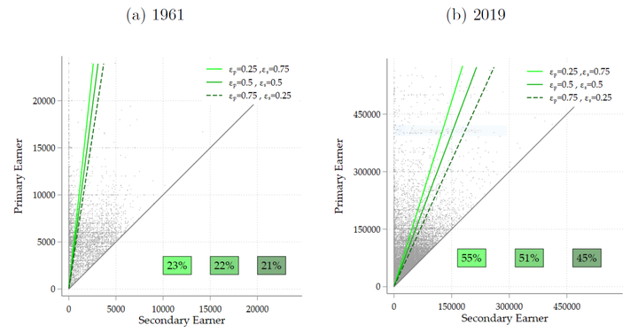 This paper studies the tax treatment of couples. We develop two different approaches. One is tailored to the analysis of tax systems that stick to the principle that the tax base for couples is the sum of their incomes. The other is tailored to the analysis of reforms towards individual taxation. We study the US federal income tax since the 1960s through the lens of this framework. We find that, in the recent past, realizing efficiency gains would have required lowering marginal tax rates for secondary earners. We also find that revenue-neutral reforms towards individual taxation are in the interest of couples with high secondary earnings while couples with low secondary earnings are made worse off. The support for such a reform recently passed the majority threshold. It is rejected, however, by a Rawlsian social welfare function. Thus, there is a tension between Rawlsian and Feminist notions of social welfare.
